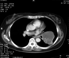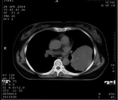 女,62岁。右大腿滑膜肉瘤,术后左下肺转移,9.5×7.5cm。CT引导下瘤内注射今又生,1×1012VP/次/周,共8次,结合60Gy放射照射。治疗后肿瘤缩小48%,CT示瘤内低密度区占50%以上,即肿瘤大部分坏死。