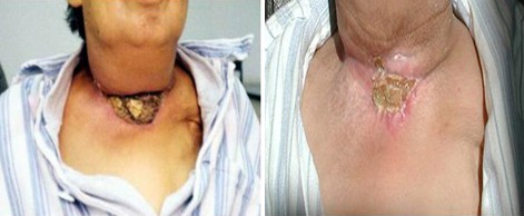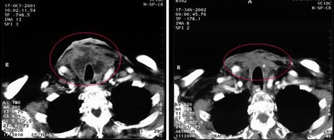 女性,69岁,甲状腺癌,术后9个月局部复发,放疗、化疗、热疗均失败,肿瘤压迫气管及颈前皮肤形成的癌痂造成呼吸困难。治疗前CT显示颈前肿瘤22.5cm2。治疗方案:今又生肿瘤内注射今又生1×1012VP/次/周×8;联合浅部热疗。结果:治疗后1月,颈前肿瘤缩小到11.7cm2,缩小了48%,压迫气管的癌痂脱落,呼吸困难的症状完全缓解。