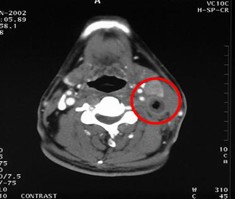 患者病情:鼻咽癌,左颈前、后两个淋巴结转移,大小近似,均为5.7cm2。治疗方案:前淋巴结接受放疗40Gy,后淋巴结注射今又生1×1012VP/次/周×4,联合40Gy放疗。治疗后,前、后淋巴结体积均缩小,前淋巴结缩小到2.9cm2,缩小40%;后淋巴结缩小到1 cm2,缩小72%,而且CT可见其内部空洞坏死,无癌细胞。