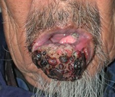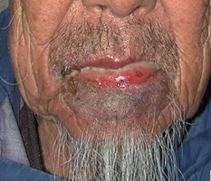 男, 67岁,下唇鳞状细胞癌,T4N2aM0。治疗方案:今又生联合化疗。今又生2×1012 VP /次,10 ml 生理盐水稀释后,20-30 分钟内动脉介入药盒给药,1次/5天,共完成10次。化疗方案为:奥沙利铂(200mg, 第1天)+博莱霉素(8mg,第2,6,8天)+甲氨喋呤(30mg, 第1,8天),完成2个疗程。治疗后2个月,肿瘤完全消退。